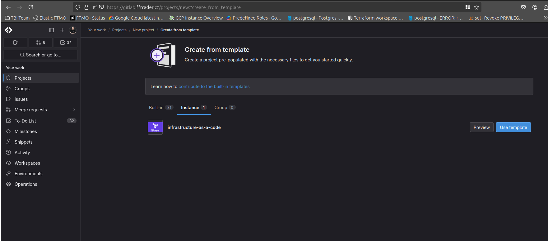 - Select New Project -> Create from template -> Instance -> infrastructure-as-a-code (Use template).