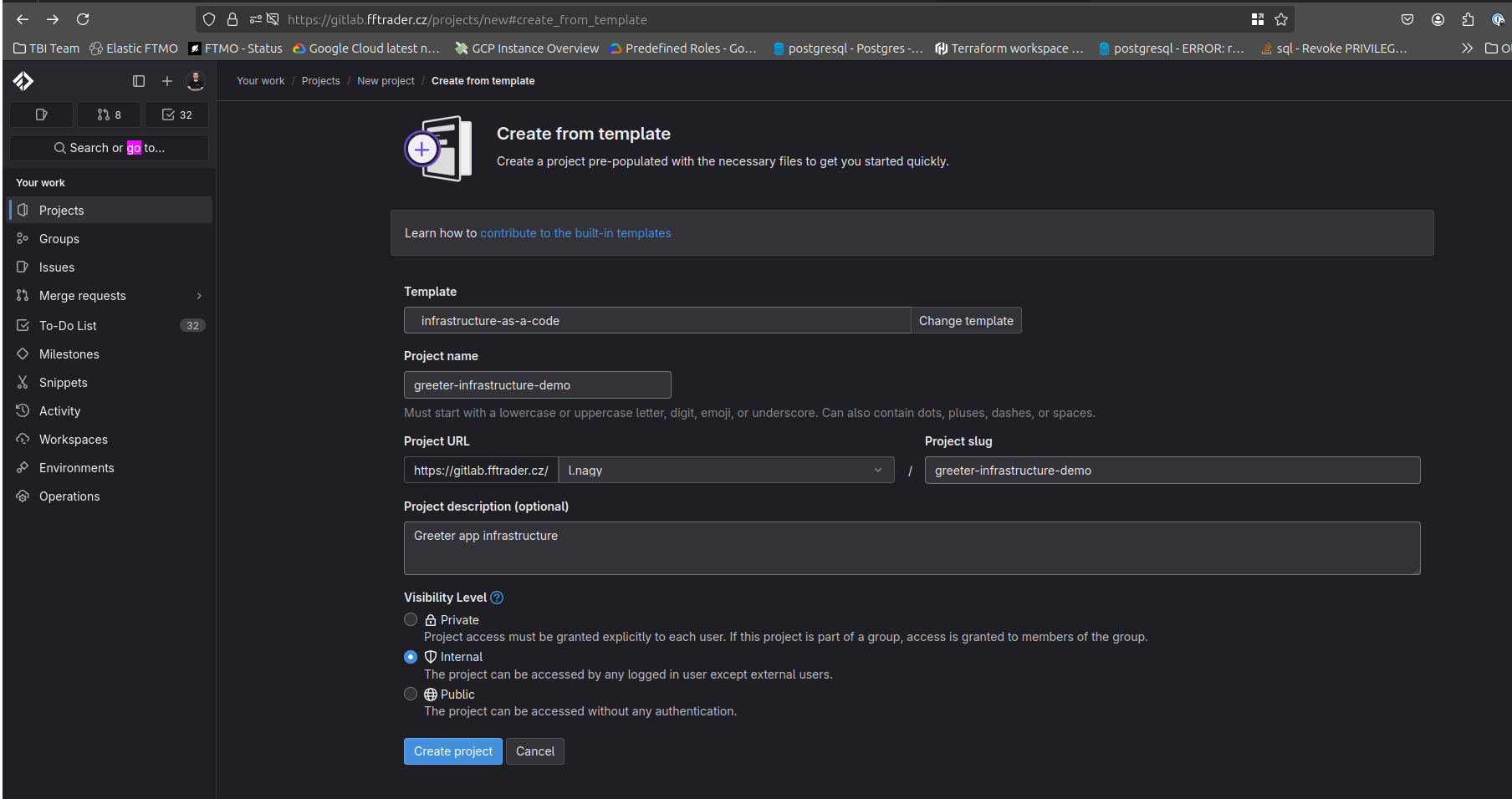 It is designed to be used with Terraform template repository, we provide on our Gitlab instance. Let's create it for our Greeter app infrastructure.
