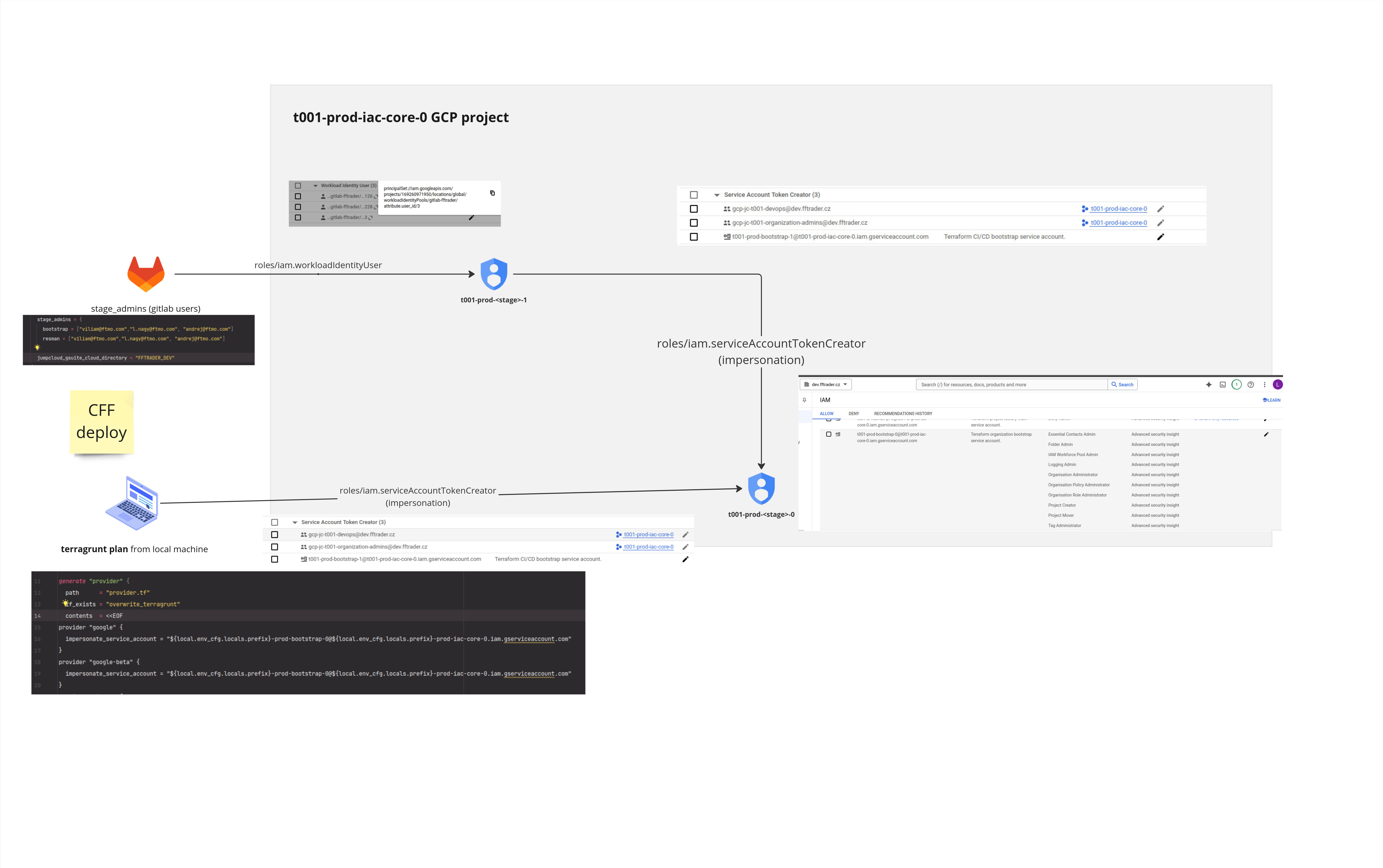 - We grant gitlab users Workload Identity User IAM to bootstrap-1 account, so we call it from the GitLab pipeline.