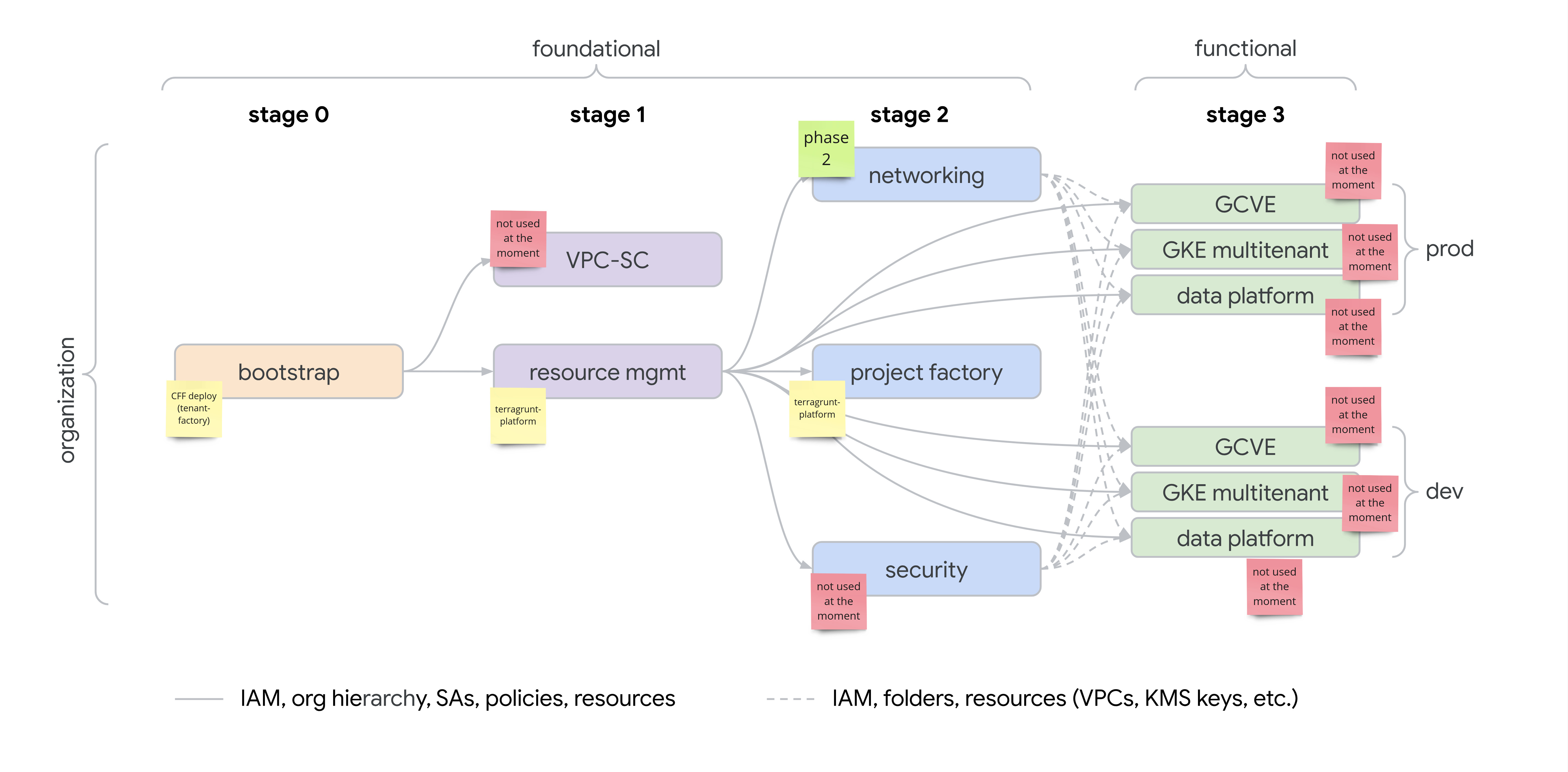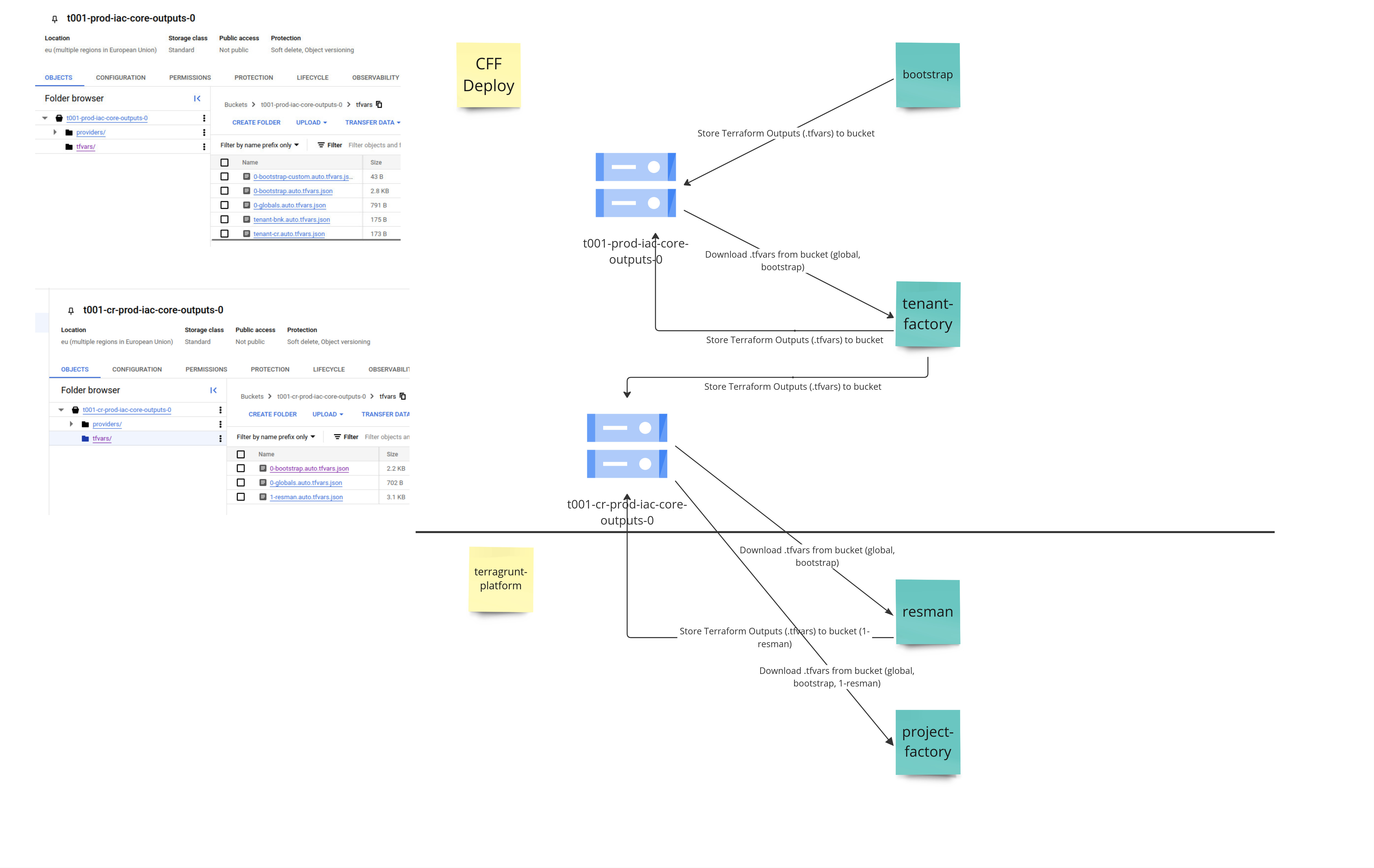 - tenant have its own bootstrap GCP project, containing Terraform state files for further stages.