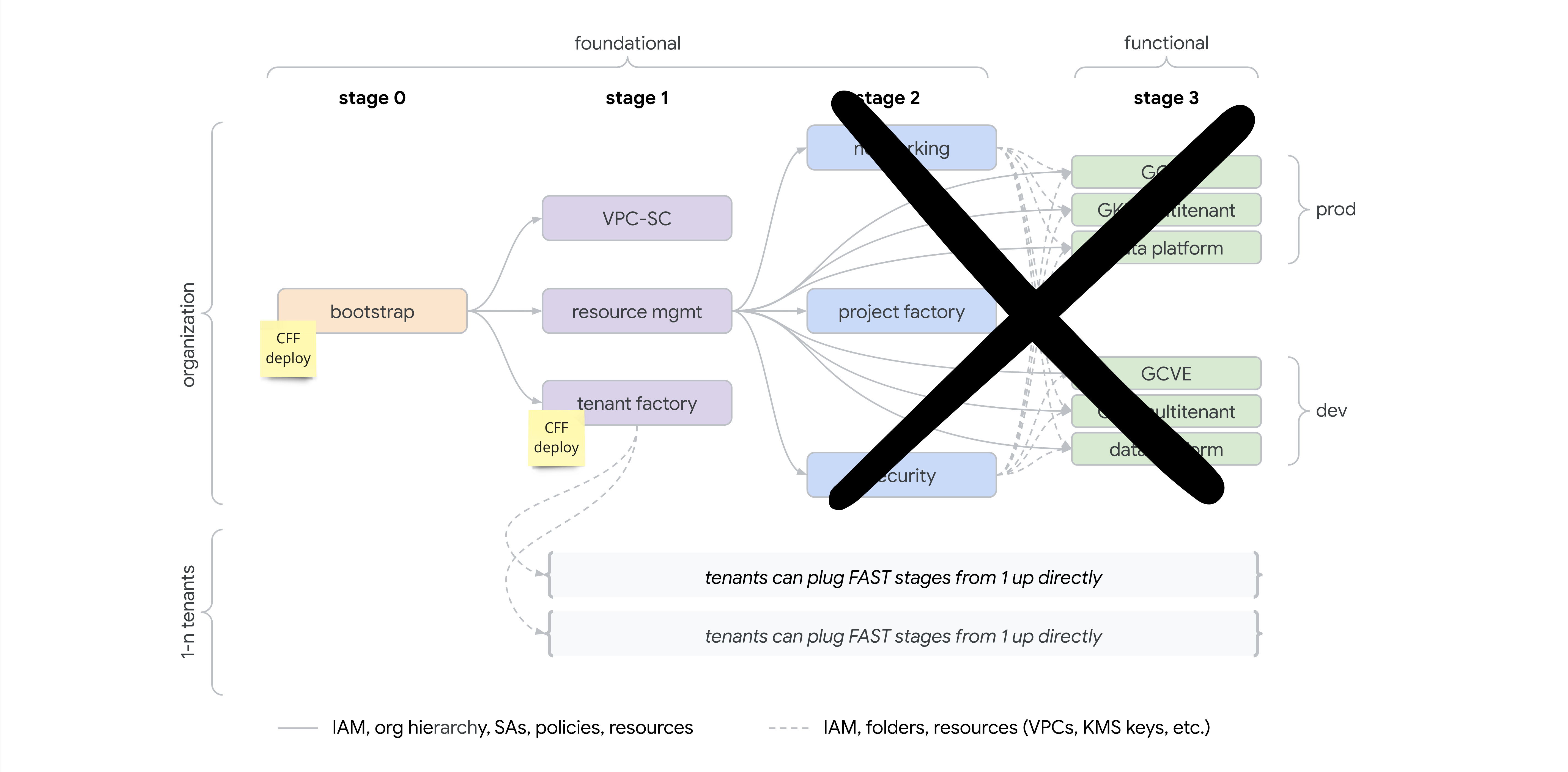 - FAST framework creates automation service accounts with IAM roles for stage (bootstrap-0)