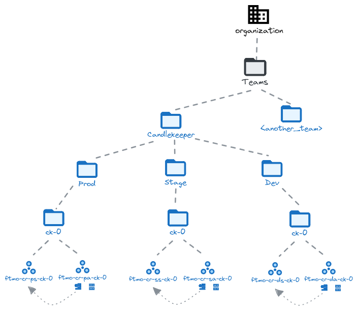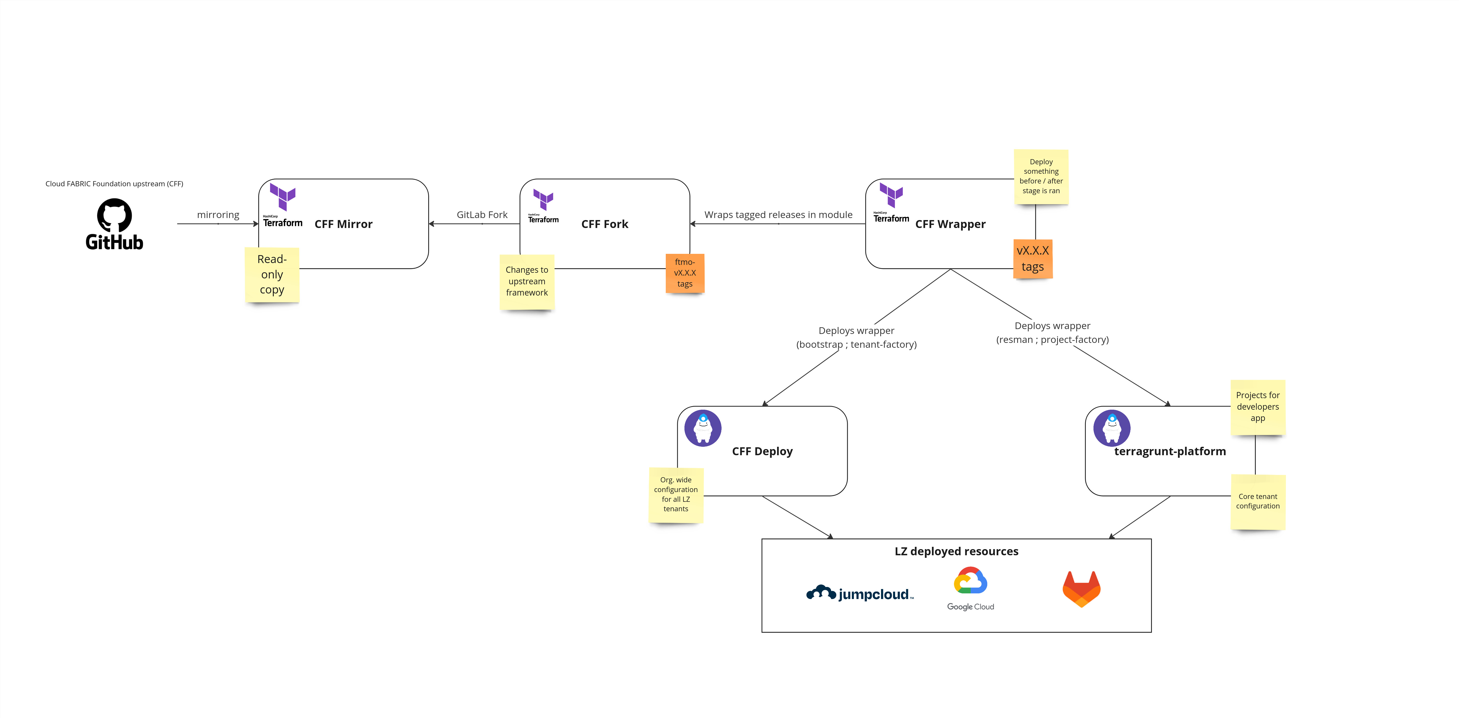 We needed to mirror data from the official CFF repository so we created the CFF Mirror gitlab project that is read-only code and tags from upstream. CFF Fast Framework which we use to deploy the landing zone recommends fork-and-own hence the need for the CFF Fork project. Lastly, there is the CFF Deploy repository which uses ftmo tags from Fork to deploy FAST stages(0,1).