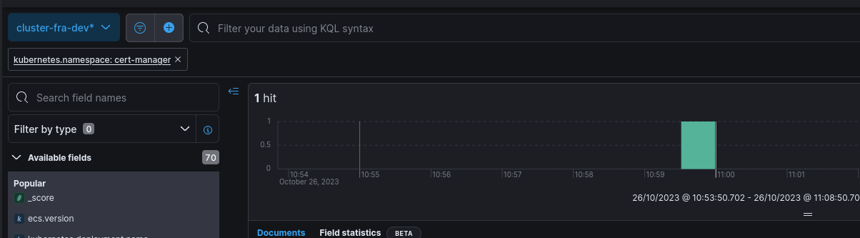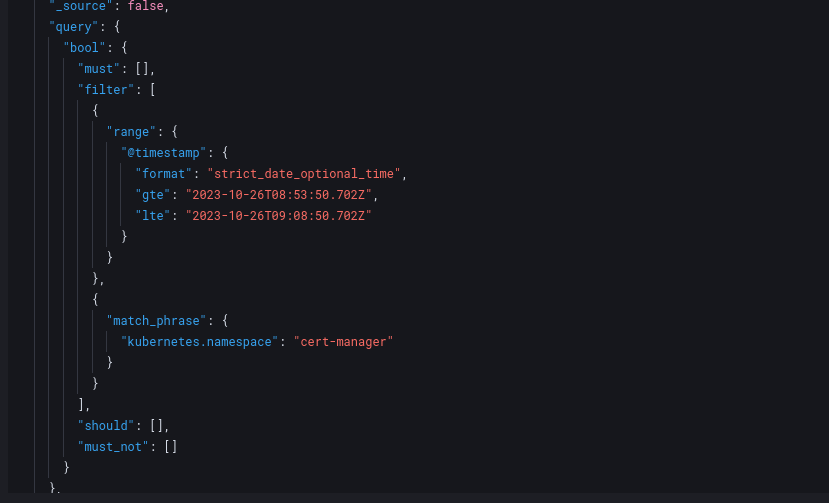 GET /cluster-fra-dev/_search { "query": { "bool": { "must": [], "filter": [ { "range": { "@timestamp": { "format": "strict_date_optional_time", "gte": "2023-10-26T08:45:03.732Z", "lte": "2023-10-26T09:15:03.732Z" } } }, { "match_phrase": { "kubernetes.namespace": "cert-manager" } } ], "should": [], "must_not": [] } } }hitsand validate if it returns expected number of documents. It can showeqorgte-gteis estimation, whileeqis the true number of documents - Now that the query is verified, you can run it by Delete by Query API. It's good idea to run the job asynchronously with